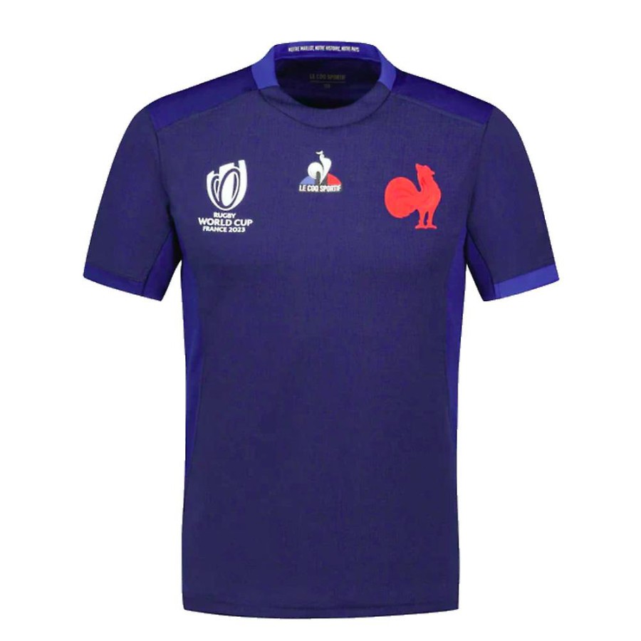 De officiële Rugby World Cup 2023 home replica jersey. Het heeft een identiek ontwerp als het ontwerp dat door de spelers wordt gedragen in zijn nieuwe dynamische blauw. Dit shirt is gemaakt van een ademend en duurzaam materiaal en heeft een patroon dat is geïnspireerd op de speciale weeftechniek van het shirt dat wordt gedragen door de spelers van de XV de France en dat voortkomt uit de knowhow van Le Coq Sportif. PersonalisatieNaam & Nummer - Personaliseer uw shirt met de naam en het nummer van uw favoriete speler of zelfs uw eigen naam. We kunnen de naam afdrukken in dezelfde stijl die door de spelers wordt gedragen.